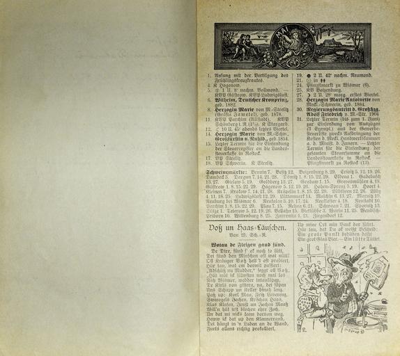 | Keywords: Mecklenburgischer Kalender 1909 012.jpg Großherzoglich Mecklenburg-Schwerinscher und Mecklenburg Strelitzscher Kalender für 1909 Hinstorff'sche Verlagsanstalt Wismar own photo of item in own collection 1909 anonymous PD-old-100 Mecklenburgischer Kalender 1909 Photos by User AndreasPraefcke |