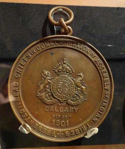 | Keywords: Medal commemorating visit of Duke and Duchess of Cornwall (later King George V and Queen Mary) to Siksika peoples near Calgary, 1901, view 1 - Glenbow Museum - DSC01090.JPG en Exhibit in the Glenbow Museum 130 9th Ave S E Calgary Alberta Canada This work is old enough so that it is in the public domain Photography was permitted in the museum without restriction 2013-09-21 12 52 48 own Daderot cc-zero Uploaded with UploadWizard Indigenous cultures in the Glenbow Museum Siksika Nation George V of the United Kingdom on medals |