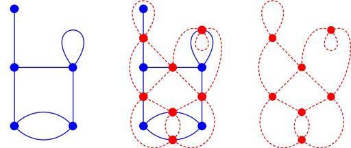 | Keywords: Medial graph example.svg en Example of a plane graph in blue and its medial graph in red <source lang latex > \documentclass article \thispagestyle empty \usepackage tikz \def\nodeDist 2 5cm \tikzstyle origVertex draw blue fill shape circle \tikzstyle newVertex draw red fill shape circle \tikzstyle invisibleVertex shape circle \tikzstyle origEdge blue \tikzstyle newEdge red densely dashed \tikzstyle invisibleEdge draw opacity 0 \begin document \begin tikzpicture node distance \nodeDist semithick \nodeorigVertex 0 ; \nodeorigVertex 1 right of 0 ; \nodeorigVertex 2 above of 0 ; \nodeorigVertex 3 above of 1 ; \nodeorigVertex 4 above of 2 ; \path 0 edgeorigEdge out -45 in -135 nodeinvisibleVertex m0 1 edgeorigEdge out 45 in 135 nodeinvisibleVertex m1 1 edgeorigEdge nodeinvisibleVertex m2 2 1 edgeorigEdge nodeinvisibleVertex m3 3 2 edgeorigEdge nodeinvisibleVertex m4 3 edgeorigEdge nodeinvisibleVertex m5 4 3 edgeorigEdge out 125 in 55 looseness 30 nodeinvisibleVertex m6 3 ; \path m0 edgeinvisibleEdge out 135 in -135 m1 edgeinvisibleEdge out 45 in -45 m1 edgeinvisibleEdge out -145 in -135 looseness 1 7 m2 edgeinvisibleEdge out -35 in -45 looseness 1 7 m3 m1 edgeinvisibleEdge m2 edgeinvisibleEdge m3 m2 edgeinvisibleEdge m4 edgeinvisibleEdge out 135 in -135 m5 m3 edgeinvisibleEdge m4 edgeinvisibleEdge out 45 in 15 m6 m4 edgeinvisibleEdge m5 edgeinvisibleEdge out 90 in 165 m6 m5 edgeinvisibleEdge out 125 in 55 looseness 30 m5 m6 edgeinvisibleEdge out -125 in -55 looseness 15 m6 ; \end tikzpicture \begin tikzpicture node distance \nodeDist semithick \nodeorigVertex 0 ; \nodeorigVertex 1 right of 0 ; \nodeorigVertex 2 above of 0 ; \nodeorigVertex 3 above of 1 ; \nodeorigVertex 4 above of 2 ; \path 0 edgeorigEdge out -45 in -135 nodenewVertex m0 1 edgeorigEdge out 45 in 135 nodenewVertex m1 1 edgeorigEdge nodenewVertex m2 2 1 edgeorigEdge nodenewVertex m3 3 2 edgeorigEdge nodenewVertex m4 3 edgeorigEdge nodenewVertex m5 4 3 edgeorigEdge out 125 in 55 looseness 30 nodenewVertex m6 3 ; \path m0 edgenewEdge out 135 in -135 m1 edgenewEdge out 45 in -45 m1 edgenewEdge out -145 in -135 looseness 1 7 m2 edgenewEdge out -35 in -45 looseness 1 7 m3 m1 edgenewEdge m2 edgenewEdge m3 m2 edgenewEdge m4 edgenewEdge out 135 in -135 m5 m3 edgenewEdge m4 edgenewEdge out 45 in 15 m6 m4 edgenewEdge m5 edgenewEdge out 90 in 165 m6 m5 edgenewEdge out 125 in 55 looseness 30 m5 m6 edgenewEdge out -125 in -55 looseness 15 m6 ; \end tikzpicture \begin tikzpicture node distance \nodeDist semithick \nodeinvisibleVertex 0 ; \nodeinvisibleVertex 1 right of 0 ; \nodeinvisibleVertex 2 above of 0 ; \nodeinvisibleVertex 3 above of 1 ; \nodeinvisibleVertex 4 above of 2 ; \path 0 edgeinvisibleEdge out -45 in -135 nodenewVertex m0 1 edgeinvisibleEdge out 45 in 135 nodenewVertex m1 1 edgeinvisibleEdge nodenewVertex m2 2 1 edgeinvisibleEdge nodenewVertex m3 3 2 edgeinvisibleEdge nodenewVertex m4 3 edgeinvisibleEdge nodenewVertex m5 4 3 edgeinvisibleEdge out 125 in 55 looseness 30 nodenewVertex m6 3 ; \path m0 edgenewEdge out 135 in -135 m1 edgenewEdge out 45 in -45 m1 edgenewEdge out -145 in -135 looseness 1 7 m2 edgenewEdge out -35 in -45 looseness 1 7 m3 m1 edgenewEdge m2 edgenewEdge m3 m2 edgenewEdge m4 edgenewEdge out 135 in -135 m5 m3 edgenewEdge m4 edgenewEdge out 45 in 15 m6 m4 edgenewEdge m5 edgenewEdge out 90 in 165 m6 m5 edgenewEdge out 125 in 55 looseness 30 m5 m6 edgenewEdge out -125 in -55 looseness 15 m6 ; \end tikzpicture \end document </source> Self 2012-12-08 Cc-zero Undirected planar graphs Images with LaTeX source code |