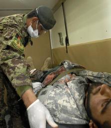 | Keywords: Medic course performs medevac training DVIDS374300.jpg en An Afghan air force airman in his final week of the Medic course at Regional Military Training Center in Kandahar Afghanistan monitors an injured soldier in back of an ambulance during a battlefield scenario The Medic course is an eight week course that covers life saving skills and has members of the Afghan National Army Afghan air force and Afghan National Civil Order of Police 2011-03-05 Petty Officer 2nd Class David Kolmel https //www dvidshub net/image/374300 110305-N-+++++-008 2011-03-07 07 56 KANDAHAR AIRFIELD AF PD-USGov-Military-Navy Kandahar International Airport Images from DoD uploaded by Fæ |