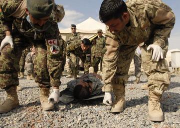 | Keywords: Medic course performs medevac training DVIDS374302.jpg en An Afghan air force airman and Afghan National Civil Order Policeman in their final week of the Medic course at Regional Military Training Center in Kandahar Afghanistan prepare to lift a litter with an injured soldier on it during battlefield scenario The Medic course is an eight week course that covers life saving skills and has members of the Afghan National Army Afghan air force and Afghan National Civil Order of Police 2011-03-05 Petty Officer 2nd Class David Kolmel https //www dvidshub net/image/374302 110305-N-+++++-010 2011-03-07 08 01 KANDAHAR AIRFIELD AF PD-USGov-Military-Navy Kandahar International Airport Images from DoD uploaded by Fæ |
