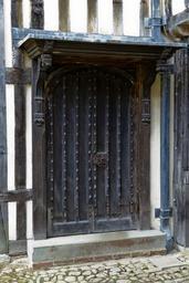 Keywords: medieval oak door and surround canopy lead roof lead rainwater pipe timber framed wall render ightham mote kent uk