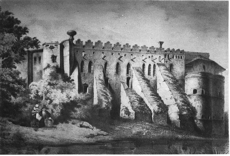 Keywords: Medzhibozh Castle2 1850.jpg Key words Medzhybizh Castle Medzhibozh Castle from a circa 1850 print 2006-12-29 own assumed Klezmer~commonswiki Medzhybizh Castle