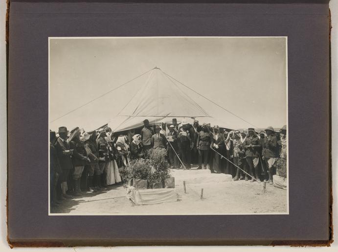 | Keywords: Meetings of British, Arab, and Bedouin officials in Amman, Jordan, April 1921 - File 28.tif en Photographs show meetings between Arab Bedouin and British officials around April 17-27 1921 at Amir Abdullah ibn Hussein's camp at Amman Jordan During these meetings British High Commissioner Herbert Samuel proclaimed Amir Abdullah as the ruler of Transjordan under British protection Among the persons depicted are Amir Abdullah John D Whiting possibly Sheik Sultan of the Belka Sultan ibn 'Ali id Diab ul 'Adwan Amir Shaker bin Zeid future Regent of Transjordan Bedouin chief Auda Abu Tayi Sheik Majid Pasha el Adwan Herbert Samuel British civil administrator Wyndham Deedes British diplomat Albert Abramson T E Lawrence Lawrence of Arabia and possibly Iraq civil administrator Gertrude Bell Also shown are horse racing an airplane landing at Abdullah's camp Circassian leaders Abudullah's bodyguard on camels and Herbert Samuel reading his proclamation of Abdullah as leader of Transjordan Reproduction Number LC-DIG-ppmsca-15304 digital files of original photos LC-DIG-ppmsca-15305 digital files of album pages Rights Advisory No known restrictions on publication Access Advisory For reference access please use the digital images in the online catalog to preserve the fragile original items Notes Photographs were created by the photographers of the American Colony Photo Department located in Jerusalem Founded in the late 1890s by Elijah Meyers the photo agency was headed during its heyday ca 1903-1933 by Lewis Larsson whose staff photographers included Erik Lind Lars Lind Furman Baldwin and G Eric Matson It transitioned into the Matson Photo Service around 1940 with photography by Matson Hanna Safieh Joseph H Giries and others John D Whiting contributed periodically to the work of both agencies The images in this album were probably taken by Lewis Larsson and/or Eric Matson For more information see http //hdl loc gov/loc pnp/pp matpc and http //www loc gov/rr/print/coll/629_whiting html Some caption information for these photographs based on information from matching negatives in the G Eric and Edith Matson Photograph Collection LC-M32-1942 LC-M32-1952 LC-M32-1951 LC-M32-1954 LC-M32-1956 M32-1957 and LC-M32-50280-x Album unpaginated album page numbers supplied by Library staff Pages 1-2 and verso of each page are blank One unattached photograph was found with the album and is stored with it Photograph is a portrait of a Jordanian man in traditional dress Blind stamp Hagop Berberian Amman Stamped on verso Copyright reserved By appointment to H M the King photographers Hagop Berberian Son More information about the events and people depicted in the album are available in the John D Whiting Supplementary Archive Box 1 LOT title devised by Library staff John D Whiting's diaries correspondence and other materials are located in the Library of Congress Manuscript Division Papers of John D Whiting Forms part of Visual materials from the papers of John D Whiting Library of Congress Transfer; Manuscript Division; 2006; DLC/PP-2006 051 29 Subjects Samuel Herbert Louis Samuel --Viscount --1870-1963 Lawrence T E -- Thomas Edward --1888-1935 Abdullah --King of Jordan --1882-1951 Deedes Wyndham Henry --Sir --1883-1956 Shākir ibn Zayd --Prince son of Zayd ibn Fawwāz Amir of Ṭāʾif --1885-1934 Bell Gertrude Lowthian --1868-1926 Jordan--History--1919-1946 American Colony Jerusalem --People--1920-1930 British--Jordan--Amman--1920-1930 Arabs--Jordan--Amman--1920-1930 Bedouins--Jordan--Amman--1920-1930 Circassians--Jordan--Amman--1920-1930 Tribal chiefs--Jordan--Amman--1920-1930 Meetings--Jordan--Amman--1920-1930 Camps--Jordan--Amman--1920-1930 Government officials--Jordan--Amman--1920-1930 Biplanes--Jordan--Amman--1920-1930 Proclamations--Jordan--Amman--1920-1930 April 17-27 1921 http //www loc gov/pictures/item/mpc2010001545/PP/resource/ Whiting John D John David 1882-1951 photographer Larsson Lewis photographer Matson G Eric Gästgifvar Eric 1888-1977 photographer other versions Wikimedia Levant - GLAM PD-Jordan 1921 Herbert Samuel and Amir Abdullah meetings |