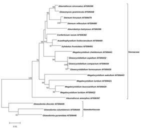 | Keywords: Megalocystidium-Minimum Evolution-Tree.svg Figure Evolutionary relationship of Megalocystidium <br/> The evolutionary history was inferred using the Minimum Evolution method 1 The optimal tree with the sum of branch length 0 36807172 is shown The percentage of replicate trees in which the associated taxa clustered together in the bootstrap test 1000 replicates are shown next to the branches 2 The tree is drawn to scale with branch lengths in the same units as those of the evolutionary distances used to infer the phylogenetic tree The evolutionary distances were computed using the Kimura 2-parameter method 3 and are in the units of the number of base substitutions per site The ME tree was searched using the Close-Neighbor-Interchange CNI algorithm 4 at a search level of 2 The Neighbor-joining algorithm 5 was used to generate the initial tree The analysis involved 20 nucleotide sequences All positions with less than 95 site coverage were eliminated That is fewer than 5 alignment gaps missing data and ambiguous bases were allowed at any position Evolutionary analyses were conducted in http //megasoftware net/ MEGA6 2<br/> 1 Rzhetsky A and Nei M 1992 A simple method for estimating and testing minimum evolution trees Molecular Biology and Evolution 9 945-967 <br/> 2 Felsenstein J 1985 Confidence limits on phylogenies An approach using the bootstrap Evolution 39 783-791 <br/> 3 Kimura M 1980 A simple method for estimating evolutionary rate of base substitutions through comparative studies of nucleotide sequences Journal of Molecular Evolution 16 111-120 <br/> 4 Nei M and Kumar S 2000 Molecular Evolution and Phylogenetics Oxford University Press New York <br/> 5 Saitou N and Nei M 1987 The neighbor-joining method A new method for reconstructing phylogenetic trees Molecular Biology and Evolution 4 406-425 <br/> 6 Tamura K Stecher G Peterson D Filipski A and Kumar S 2013 MEGA6 Molecular Evolutionary Genetics Analysis version 6 0 Molecular Biology and Evolution30 2725-2729 <br/> ; List of GenBank-Sequences http //www ncbi nlm nih gov/nuccore/AF506400 Acanthophysellum lividocoeruleum AF506400 http //www ncbi nlm nih gov/nuccore/AF506398 Aleurobotrys botryosus AF506398 http //www ncbi nlm nih gov/nuccore/AF506399 Aleurodiscus cerussatus AF506399 http //www ncbi nlm nih gov/nuccore/AF506382 Conferticium ravum AF506382 http //www ncbi nlm nih gov/nuccore/AF506432 Gloeocystidiellum aspellum AF506432 http //www ncbi nlm nih gov/nuccore/AF506434 Gloeocystidiellum compactum AF506434 http //www ncbi nlm nih gov/nuccore/AF506439 Gloeocystidiellum formosanum AF506439 http //www ncbi nlm nih gov/nuccore/AF506444 Gloeodontia columbiensis AF506444 http //www ncbi nlm nih gov/nuccore/AF506445 Gloeodontia discolor AF506445 http //www ncbi nlm nih gov/nuccore/AF506446 Gloeodontia pyramidata AF506446 http //www ncbi nlm nih gov/nuccore/AF506448 Gloeomyces graminicola AF506448 http //www ncbi nlm nih gov/nuccore/AF506441 Megalocystidium chelidonium AF506441 http //www ncbi nlm nih gov/nuccore/AF506420 Megalocystidium leucoxanthum AF506420 http //www ncbi nlm nih gov/nuccore/AF506421 Megalocystidium luridum AF506421 http //www ncbi nlm nih gov/nuccore/AF506422 Megalocystidium luridum AF506422 http //www ncbi nlm nih gov/nuccore/AF506443 Megalocystidium wakullum AF506443 http //www ncbi nlm nih gov/nuccore/AF506479 Stereum hirsutum AF506479 http //www ncbi nlm nih gov/nuccore/AF506480 Stereum reflexulum AF506480 http //www ncbi nlm nih gov/nuccore/AF506491 Xylobolus frustulatus AF506491 http //www ncbi nlm nih gov/nuccore/AF506397 Aleurodiscus amorphus AF506397 own 2014-09-09 Thkgk Cc-zero other versions Megalocystidium |