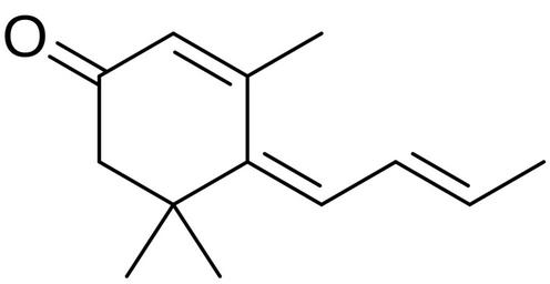 Keywords: Megastigmatrienone.svg Chemical structure of megastigmatrienone tabanone Own 20 35 22 September 2016 UTC Ed Edgar181 Cyclohexenes Ketones