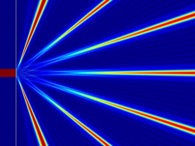 Keywords: Mehrfachspalt-Numerisch.png de Numerisch berechnete Intensitätsverteilung hinter einem Mehrfachspalt dargestellt als Hitzefeld Nicht berücksichtigt wurde die Freiraumdämpfung Deutlich zu erkennen die Hauptmaximas und dazu schwach die Nebenmaximas Hier wurde zur weiteren Veranschaulichung kein endliches Gitter sondern eine Wellenfront mit begrenzter Weite eingezeichnet In der Nähe des Gitter treten Alias-Effekte auf die wegen der begrenzten Auflösung entstehen 2014-03-15 18 01 33 own Miessen other fields MATLAB n + octave diffraction_grating m /usr/bin/octave -qf \usr\bin\octave Miessen 2014 getParameters function setParameters config global parameters; parameters grating_distance getConfigValue config grating_width ; parameters dim_x int32 getConfigValue config dim_x ; parameters dim_y int32 getConfigValue config dim_y ; parameters free_space_loss getConfigValue config free_space_loss ; parameters gap_width getConfigValue config gap_width ; parameters grating_count int32 getConfigValue config grating_count ; parameters grating_distance getConfigValue config grating_distance ; parameters offset_x int32 getConfigValue config offset_x ; parameters scaling_meter_per_px getConfigValue config scaling_meter_per_px ; parameters wave_length getConfigValue config wave_length ; endfunction findGapPositions function gaps findGapPositions grating_distance grating_count if grating_count < 2 error grating_count too small ; endif width grating_distance double grating_count -1 ; gaps ; for i 0 grating_count-1 gaps gaps i grating_distance-width/2 ; endfor endfunction gratingSignalStrength function amplitude gratingSignalStrength x y gaps wave_length free_space_loss grating gaps sub_steps gap_width free_space_loss not implemented calculate distances distances ; for gap_pos gaps distances distances sqrt y-gap_pos 2 + x 2 ; endfor calculate amplitudes c_amps ; base_distance sqrt x 2 + y 2 ; for d distances delay d - base_distance; phase 2 pi delay/wave_length; amplitude phasor c_amp residual rem d wave_length ; phase 2 pi residual/wave_length; c_amp complex cos phase sin phase ; c_amp c_amp / d; free_space_loss check - Integrate a slit c_amps c_amps c_amp; endfor calculate amplitude amplitude abs sum c_amps /length gaps ; eliminate free_space_loss max_sum sum abs c_amps /length gaps ; amplitude amplitude/max_sum; endfunction slitSignalStrength function amplitude slitSignalStrength x y sub_steps gap_width wave_length free_space_loss endfunction calculateDiffraction function amplitudes calculateDiffraction gaps printf Calculate Diffraction\n ; global parameters; Read globals dim_y parameters dim_y; dim_x parameters dim_x; scaling_meter_per_px parameters scaling_meter_per_px; offset_x parameters offset_x; wave_length parameters wave_length; free_space_loss parameters free_space_loss; Calculate dimensions x_max double dim_x - offset_x - 1 scaling_meter_per_px; y_width double dim_y - 1 scaling_meter_per_px; y_max y_width / 2 ; y_min -1 y_max; Initialize amplitudes zeros dim_y dim_x - offset_x ; for amp_pos_x int32 1 dim_x - offset_x printf 3d 100 amp_pos_x/ dim_x - offset_x ; for amp_pos_y int32 1 1 dim_y x double amp_pos_x scaling_meter_per_px; y y_min + double amp_pos_y scaling_meter_per_px; amp gratingSignalStrength x y gaps wave_length free_space_loss ; amplitudes amp_pos_y amp_pos_x amp; row y / column x endfor printf \b\b\b\b ; endfor printf Finished calculateDiffraction\n ; endfunction generateGrating function rgb generateGrating rgb printf Generate Grating\n ; global parameters; dim_y parameters dim_y; grating_count parameters grating_count; grating_distance parameters grating_distance; gap_width parameters gap_width; offset_x parameters offset_x; scaling_meter_per_px parameters scaling_meter_per_px; // gray zeros dim_y offset_x ; y_width double dim_y - 1 scaling_meter_per_px; y_max y_width / 2 ; even or odd if round rem grating_count 2 1 even_factor 0 5; grating_distance/2 ; else even_factor 0 ; endif for y_px int32 1 dim_y y double y_px scaling_meter_per_px; stepper y / grating_distance; normalize sub_stepper stepper + even_factor - round stepper ; sub_stepper rem stepper 1 ; stepper odd -0 5 +0 5 even 0 0 1 0 Nachkommazahlen sub_stepper +/- 0 5 grating_distance around gap for x_px offset_x-int32 double offset_x /40 offset_x if abs sub_stepper < gap_width rgb y_px x_px 0 0 0 ; else rgb y_px x_px 0 8 0 8 0 8; endif endfor endfor endfunction generateLaser function amplitudes generateLaser printf Generate Laser\n ; global parameters; dim_y parameters dim_y; grating_count parameters grating_count; grating_distance parameters grating_distance; offset_x parameters offset_x; scaling_meter_per_px parameters scaling_meter_per_px; y_width double dim_y - 1 scaling_meter_per_px; y_min -1 y_width / 2 ; laser_width grating_distance double grating_count amplitudes ; for y_px int32 1 dim_y y y_min + double y_px scaling_meter_per_px; if abs y < laser_width / 2 amplitudes amplitudes; ones 1 offset_x ; else amplitudes amplitudes; zeros 1 offset_x ; endif endfor endfunction M A I N global parameters begin_cputime cputime ; printf Including CSV library\n ; echo_csv_lib 0; source /lib/csv_lib m ; printf Including config library\n ; global echo_config_lib 0; source /lib/load_config_lib m ; printf Starting\n ; arg_list argv ; if rows arg_list 2 ; printf wrong parameters config file and output file needed \n ; exit ; endif config_filename arg_list 1 ; output_filename arg_list 2 ; config loadConfig config_filename ; config setParameters config ; gaps findGapPositions parameters grating_distance parameters grating_count ; gaps dim step wavelength printf Dimensions \n ; Debug x_width parameters scaling_meter_per_px double parameters dim_x y_width parameters scaling_meter_per_px double parameters dim_y amp gratingSignalStrength x_width 0 gaps parameters wave_length parameters free_space_loss ; amp diffractionMap calculateDiffraction gaps ; max max diffractionMap diffractionPowerMap diffractionMap 2; laserMap generate