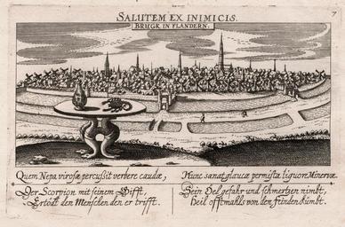 | Keywords: Meisner Brugge.jpg Artwork Creator Daniel Meisner Intellectual creator of the Thesaurus philopoliticus and author of the emblematic text for Book I Creator Eberhard Kieser director of the etcher/engraver workshop and editor of the Thesaurus philopoliticus editions Book I 1623-1626 and Book II 1627-1631 BRUGK IN FLANDERN Brugge en View of Bruges Belgium Engraving with emblematic verses in Latin and German from Daniel Meisner Thesaurus Philopoliticus Frankfurt am Main 1623-1632 nl Gezicht op Brugge Gegraveerde emblemaprent met moraliserende verzen in het Latijn en het Duits uit Daniel Meisner Thesaurus Philopoliticus Frankfurt am Main 1623-1632 fr Vue de Bruges Belgique Gravure emblématique avec des vers en latin et en allemand parue dans Daniel Meisner Thesaurus Philopoliticus Frankfurt am Main 1623-1632 de Stadtansicht von Brügge Belgien Emblematischer Kupferstich mit lateinischen und deutschen Sinnsprüchen aus Daniel Meisner Thesaurus Philopoliticus Frankfurt am Main 1623-1632 1627 etching copper cm 9 6 14 5 SALUTEM EX INIMICIS Emblemata titel on top Thesaurus Philopoliticus Buch 2 Teil 1 Nr 7; in the later edition Sciographia-cosmica ID E5 Daniel Meisner Thesaurus Philopoliticus Politisches Schatzkästlein' PD-old-100 Other versions Bruges in the 17th century Thesaurus Philopoliticus 1627 paintings Images by MJJR |