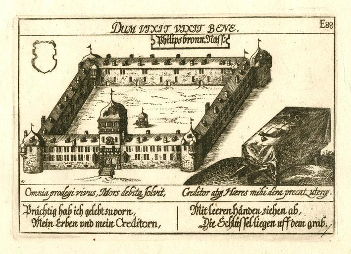 | Keywords: Meisner Philipsbronn Nass Philippsborn.jpg aus Daniel Meisner's Schatzkästlein<br /> Philipsbronn Nass Kupferstich aus Daniel Meisner ™s Schatzkästlein Ausgabe bei Paul Fürst unter dem Titel Sciographia Cosmica 1638 ff Schloss Philippsborn heute Forsthaus Neuhaus ; Saarbrücken http //www steutzger biz century 17 David Meisner Author died more than 70 years ago - public domain PD-old Thesaurus Philopoliticus Schloss Neuhaus Images from Antiquariat Steutzger | ||||