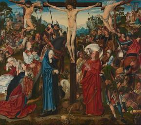 | Keywords: Meister des Aachener Altars - Kreuzigung (National Gallery, London).jpg Artwork Creator Master of the Aachen Altar circa 1490-95 oil oak cm 107 3 120 3 institution National Gallery London Sainsbury Wing Exhibition accession number NG1049 object history credit line Presented by Edward Shipperdson 1847 exhibition history This triptych was originally held in the parish church of St Columba in Cologne http //www nationalgallery org uk/paintings/master-of-the-aachen-altarpiece-the-crucifixion National Gallery London The Altarpiece with the wings now held at the Walker Art Gallery Liverpool <gallery> File Master of the Aachen Altarpiece - Triptych with Scenes from Christ's Passion reverse of right wing Two Kneeling Donors - Google Art Project jpg File Meister des Aachener Altars - Kreuzigung National Gallery London jpg File Master of the Aachen Altarpiece - Triptych with Scenes from Christ ™s Passion reverse of left wing Mass of St Gregory - Google Art Project jpg </gallery> PD-old-100 Meister des Aachener Altars German Renaissance paintings in the National Gallery London 15th-century paintings of the Crucifixion of Christ Renaissance paintings of Crucifixion of Christ Jesus Christ between the felons Paintings of the passion of Jesus Christ with multiple episodes Stabat mater Ornamental textiles in art Dice for Christ's Robe 1500s paintings |