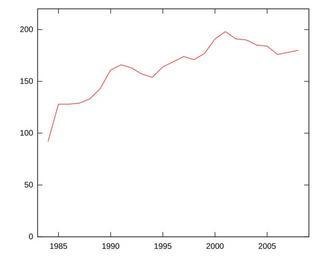 | Keywords: Membership in LDS Church in Iceland.svg Membership in The Church of Jesus Christ of Latter-day Saints in Iceland Kirkja Jesú Krists hinna síðari daga heilögu á Íslandi as a function of time Graph created in Gnuplot Data originates from Statistics Iceland as published online for the period of 1990 and later http //statice is/Statistics/Population/Religious-organizations and as published in the periodical Hagtíðindi for earlier years The data is as follows <pre> 1984 92 1985 128 1986 128 1987 129 1988 133 1989 143 1990 161 1991 166 1992 163 1993 157 1994 154 1995 164 1996 169 1997 174 1998 171 1999 177 2000 191 2001 198 2002 191 2003 190 2004 185 2005 184 2006 176 2007 178 2008 180 </pre> Graph created and uploaded on June 13 2009 Graph created by uploader in Gnuplot Religion in Iceland History of The Church of Jesus Christ of Latter-day Saints |