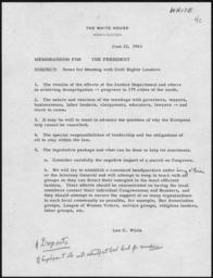 | Keywords: Memorandum For The President Notes on Meeting with Civil Rights Leaders June 22, 1963 - NARA - 193807.tif Scope and content Memorandum by Lee C White on points to cover in meeting with Civil Rights leaders General notes 193807 Local identifier President 1961-1963 Kennedy Office of the Personal Secretary 1961 - 1963 NARA-Author White Lee C Lee Calvin 1923- Author 2362950 <br /> John F Kennedy Library NLJFK Columbia Point Boston MA 02125-3398 1963-06-22 Record group Collection JFK-POF Papers of John F Kennedy President's Office Files 01/20/1961 - 11/22/1963 Record group ARC 1166 Papers of President Kennedy President's Office Files Subjects compiled 01/20/1961 - 11/22/1963 Series ARC 193779 File unit Papers of President Kennedy President's Office Files Subjects Civil Rights General 1961 - 1963 File unit ARC 193805 Variant control numbers NAIL Control Number NLK-POF-SBJCTS-CRGENERAL-2CC yes Other versions NARA-cooperation PD-USGov Documents in English Lee C White |