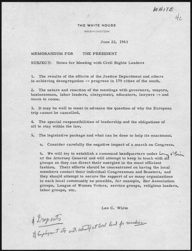 Keywords: Memorandum For The President Notes on Meeting with Civil Rights Leaders June 22, 1963 - NARA - 193807.tif Scope and content Memorandum by Lee C White on points to cover in meeting with Civil Rights leaders General notes 193807 Local identifier President 1961-1963 Kennedy Office of the Personal Secretary 1961 - 1963 NARA-Author White Lee C Lee Calvin 1923- Author 2362950 <br /> John F Kennedy Library NLJFK Columbia Point Boston MA 02125-3398 1963-06-22 Record group Collection JFK-POF Papers of John F Kennedy President's Office Files 01/20/1961 - 11/22/1963 Record group ARC 1166 Papers of President Kennedy President's Office Files Subjects compiled 01/20/1961 - 11/22/1963 Series ARC 193779 File unit Papers of President Kennedy President's Office Files Subjects Civil Rights General 1961 - 1963 File unit ARC 193805 Variant control numbers NAIL Control Number NLK-POF-SBJCTS-CRGENERAL-2CC yes Other versions NARA-cooperation PD-USGov Documents in English Lee C White |