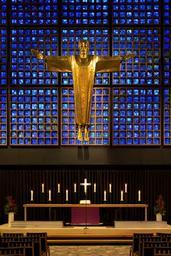 Keywords: memorial church modern altar gold cruciform christ vibrant stained glass geometric candles berlin christianity kaiser-wilhelm-gedächtnis-kirche