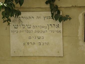 | Keywords: Memorial plaque on Aharon Chelouche's house.jpg Plaque next to residence of Aharon Chelouche Neve Tzedek Tel Aviv Israel Own 2007-08-11 Itai Hebrew text <div style text-align right; direction rtl; > בבנין זה התגורר אהרון בן אברה ש וש ממייסדי השכונות העבריות ביפו בשני תרנ ב תרפ א </div> Aharon Chelouche Chelouche street Tel Aviv Neve Tzedek Plaques in Tel Aviv-Yafo Chelouche House | ||||