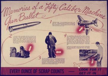 | Keywords: Memories of a Fifty Caliber Machine Gun Bullet - NARA - 533982.jpg Scope and content General notes 533982 Local identifier 179-WP-125 Office for Emergency Management War Production Board 01/1942 - 11/03/1945 Still Picture Records Section Special Media Archives Services Division NWCS-S National Archives at College Park 8601 Adelphi Road College Park MD 20740-6001 other date circa 1942 1943 Record group Record Group 179 Records of the War Production Board 1918 - 1947 Record group ARC 508 War Production Board compiled 1942 - 1943 Series ARC 533858 File unit File unit ARC Variant control numbers NAIL Control Number NWDNS-179-WP-125 Other versions <gallery> File Memories_of_a_Fifty_Caliber_Machine_Gun_Bullet_-_NARA_-_533982 tif tif File Memories_of_a_Fifty_Caliber_Machine_Gun_Bullet_-_NARA_-_533982 jpg jpg </gallery> NARA-cooperation PD-USGov World War II posters from the United States Metal recycling in the United States Recycling in the United States in World War II |