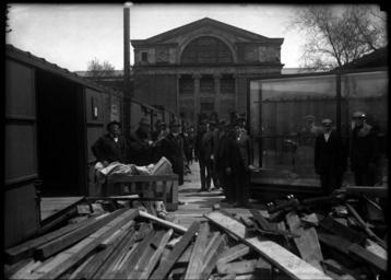 | Keywords: the field museum columbian move blackandwhite monochrome black and white Several men on wood loading dock for railroad car with exhibit cases. Either west or east side of building, smoke stack visible at left. Museum move series. Outside of the Field Columbian Museum. 1920. Original size and material: 5x7 inch glass negative Digital Identifier: CSGN40497 Part of the Illinois Urban Landscapes Project: www.fieldmuseum.org/urbanlandscapes/ Several men on wood loading dock for railroad car with exhibit cases. Either west or east side of building, smoke stack visible at left. Museum move series. Outside of the Field Columbian Museum. 1920. Original size and material: 5x7 inch glass negative Digital Identifier: CSGN40497 Part of the Illinois Urban Landscapes Project: www.fieldmuseum.org/urbanlandscapes/ |