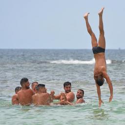 Keywords: men sea people swimming trunks summersault submerge teamwork team building