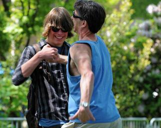 Keywords: men shaking hands hands shaking laughing smiling male people outdoors sunshine person young adult man outside people smiling young man middle age together summer man smiling smiling man happy