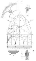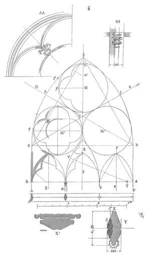 | Keywords: Meneaux.fenetre.eglise.Saint.Urbain.Troyes.png Examinons donc les meneaux des fenêtres du chœur de Saint-Urbain de Troyes 6 Soit AB la largeur de la fenêtre Sur cette largeur qui donne les axes des boudins ou colonnettes des pieds-droits ayant pour section une demi-section de meneau on a tracé l'arc brisé CDE; donc la base CD et les deux arcs de cercle circonscrivent un triangle équilatéral Divisant ce triangle équilatéral par l'axe EF et par les deux lignes CG DH passant par les milieux des deux lignes DE CE on obtient la figure EKIL dans laquelle nous inscrivons le cercle dont le centre est sur l'axe en M Marquant sur les lignes LC LD deux points M'M à une distance égale à la longueur LM on trace les deux autres cercles à l'aide de rayons égaux à celui du cercle dont le centre est en M Il est clair que ces trois cercles sont tangents et inscrits par le grand arc brisé Viollet-le-Duc Drawings by Eugène Viollet-le-Duc Plans et relevés de la basilique Saint-Urbain de Troyes Drawings of proportions |