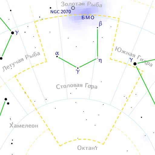 | Keywords: Mensa constellation map ru lite.png en Mensa constellation map on Russian ru Ка та созвездия Столовая Го а на усском языке It was created using the program PP3 At http //pp3 sourceforge net PP3's homepage you also get the input scripts necessary for re-compiling the map The yellow dashed lines are constellation boundaries the red dashed line is the ecliptic and the shades of blue show Milky Way areas of different brightness The map contains all Messier objects except for colliding ones The underlying database contains all stars brighter than 6 5 All coordinates refer to equinox 2000 0 The map is calculated with the equidistant azimuthal projection the zenith being in the center of the image The north pole is to the top The horizontal lines of equal declination are drawn for 0° +10° +20° etc The lines of equal rectascension are drawn for all 24 hours Towards the rim there is a very slight magnification and distortion own 2006-06-09 Denis Ibaev Constellations maps russian |