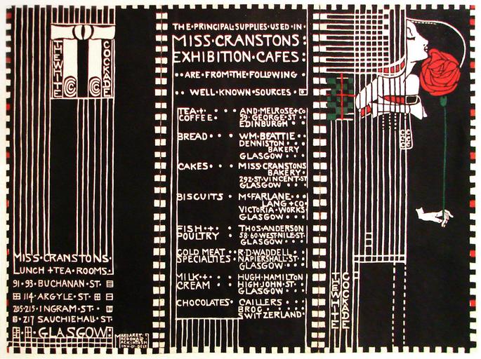 | Keywords: Menu créé par Margaret Macdonald (Lighthouse, Glasgow) (3803687088).jpg fr Ce menu du salon de thé de l'exposition écossaise de 1911 White Cockade Tea Room a été conçu par Margaret Macdonald Ce menu est exposé au centre d'interprétation de l'oeuvre de C R Mackintosh et de M Macdonald appelé The Lighthouse ancien bâtiment conçu par Mackintosh pour le journal Glasgow Herald http //www huntsearch gla ac uk/cgi-bin/foxweb/huntsearch_Mackintosh/DetailedResults fwx SearchTerm 41131 reqMethod Link www huntsearch gla ac uk/cgi-bin/foxweb/huntsearch_Mackin Charles Rennie Mackintosh 1868-1928 est un architecte peintre et designer né à Glasgow qui est considéré comme un des principaux précurseurs du mouvement moderne Avec Margaret Macdonald qui est devenue son épouse en 1900 son ami Herbert McNair et son épouse Frances Macdonald la soeur de Margaret tous issus de la Glasgow School of Art il a constitué un groupe d'artistes très novateurs pour l'époque appelé The Four influencé par l'Art Nouveau le Symbolisme et par le mouvement anglais Arts and Crafts http //www flickr com/photos/dalbera/3803687088/ Menu créé par Margaret Macdonald Lighthouse Glasgow 2009-08-04 13 12 http //www flickr com/people/72746018 N00 Jean-Pierre Dalbéra from Paris France 55 859825 -4 255283 source Flickr PD-art-70 File Upload Bot Magnus Manske 2013-02-15 Charles Rennie Mackintosh Photographs by Jean-Pierre Dalbéra Food menus in English Food menus in the United Kingdom Art Nouveau typography Red roses in art Art Nouveau paintings of women Margaret Macdonald Mackintosh |