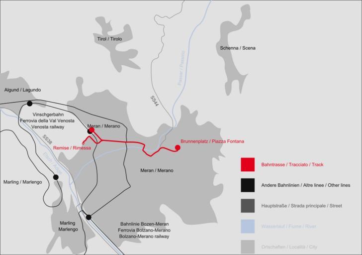 Keywords: MeranoTramMap.svg Map of the Merano tram / Karte der Meraner Straßenbahn / Mappa della tranvia di Merano Own 03 01 2007 Luigino Created with Inkscape Public transport maps of Meran Meran Tramway Tram maps of Trentino-South Tyrol Meran