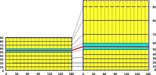 | Keywords: Mercator by Wright stretching.svg en Showing how Edward Wright calculated the Mercator parallels On an equirectangular projection calculate the parallel scale factor for one strip at mid height and use this value to widen the strip Wright actually used 540 strips 1599 and later 5400 strips 1610 to obtain highly accurate results own Peter Mercator 2010-08-06 cc-zero Mercator projections Edward Wright mathematician SVG diagrams Diagrams labelled with numbers only | ||||