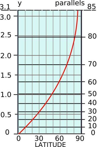 Keywords: Mercator y plot.svg en The vertical displacement y of the parallels in a Mercator projection own Peter Mercator 2010-08-06 Mercator projections Geometry diagrams Geographic diagrams