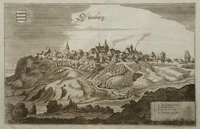 | Keywords: Merian eisenberg 1650 wikipedia.jpg de Kupferstich 20 5 x 32 cm aus Merians Topographie 1650 Slg H -P Haack Leipzig 1650 Merian; Foto H -P Haack Leipzig 16 06 18 Aug 2007 CEST other fields 1 inscription inscription <big>Eisenberg</big><br />A Das Fürstliche Schloss<br />B Die Pfar Kirche<br />C Das Rath Hause<br />D Die Strase nach Jena de PD-old-100 Original upload log de wikipedia Merian+eisenberg+1650+wikipedia jpg wikitable - 2007-08-18 14 06 1053×682× 264909 bytes H -P Haack <nowiki> Information Kupferstich 20 5 x 32 cm aus Merians Topographie 1650 Slg ~~~ ~~~~ Bild-PD-alt Andere Versionen </nowiki> History of Eisenberg Thuringia Topographia Superioris Saxoniae Thüringiae Misniae et Lusatiae Merian Eisenberg |
