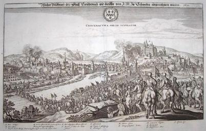| Keywords: Merian Kreuznach.jpg Wahre Bildtnuss der Statt Creutzenach wie dieselbe von I M Zu Schweden eingenohmen worden 1631 Theatrum Europaeum Vol II 1629-1633; Transferred from http //www galerie-harmonique nl/catalogus/index php productID 7016 1679 Creator Matthäus Merian PD-old-100 Creator Matthäus Merian History of Bad Kreuznach Kauzenburg Engravings of Theatrum Europaeum 1631 in Germany | ||||