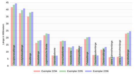 | Keywords: Meriones persicus, YiÄŸit & Çolak 1999, skull measurements (DE).svg de Schädelmaße dreier erwachsener männlicher Persischer Rennmäuse Meriones persicus aus Oltu Erzurum Türkei auf Deutsch en Skull measurements of three adult male Persian Jirds Meriones persicus from Oltu Erzurum Turkey in German own Torben Schink 2011-01-13 nach Nuri YiÄŸit Ercüment Çolak A study of the taxonomy and karyology of Meriones persicus Blanford 1875 Mammalia Rodentia in Turkey In Turkish Journal of Zoology Bd 23 Nr 3 1999 ISSN 1300-0179 S 269 “274 http //mistug tubitak gov tr/bdyim/abs php dergi zoo rak 98066 PDF 191 KB Tab 1 S 271 erstellt mit Gnuplot 4 4 DATA <pre> 2294 2295 2296 Occipitonasallänge 41 7 43 4 44 4 Condylobasallänge 37 4 39 6 40 8 Basallänge 35 1 37 9 38 4 Nasalialänge 16 3 17 8 18 2 zygomatische Breite 21 7 23 0 22 7 Interorbitalbreite 7 4 7 2 7 3 Hirnschädelbreite 17 4 17 9 17 7 Mastoidbreite 13 2 13 0 13 9 Gehörkapsellänge 11 8 12 6 13 6 Palatallänge 19 0 20 3 20 5 Gaumenspaltenlänge 7 7 7 9 7 4 Diastemalänge 11 5 12 7 13 4 obere Zahnreihenlänge 6 1 6 6 6 3 untere Zahnreihenlänge 6 4 6 6 6 6 Mandibellänge 22 9 23 5 24 6 </pre> CODE <pre> set terminal svg size 900 480 set encoding iso_8859_1 set decimalsign set border 0 set key outside center bottom horizontal Left reverse set xrange -0 5 14 5 unset xtics set ylabel Länge in Millimetern set yrange 0 45 set ytics out nomirror scale 0 01 0 5 45 format 0f set mytics 5 set grid ytics mytics lw 0 25 lc rgb 404040 lw 0 25 lc rgb C0C0C0 plot for SET 1 3 DATA using 0+ SET-2 0 25 column 1+SET 0 25 xtic 1 with boxes fs solid 0 33 noborder title Exemplar 2293+SET using 0 0 1 with labels rotate by 90 left offset 0 0 5 notitle </pre> Cc-zero Meriones persicus |