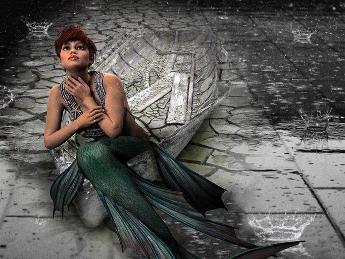Keywords: mermaid boat dry girl female fish water human person imagination model mythology woman costume harmony rain desert cracks fantasy art photo manipulation green 3d renders