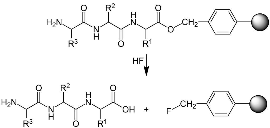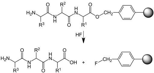 Keywords: Merrifield Synthesis 4 V.2.svg en Merrifield_Synthesis de Merrifield_Synthese_Abspaltung vom Polymer own Jü 2012-05-17 Peptide synthesis Cc-zero