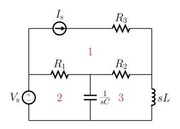 Keywords: Mesh Analysis Example1 TeX.svg LaTeX Source Code <source lang latex > \documentclasstikz margin 15px standalone \usepackage color graphicx circuitikz \usepackageload-configurations version-1 siunitx \usetikzlibrary arrows \begin document \begin circuitikz american very thick \draw 0 10 to I l \huge I_\textrm s 4 10 to R l \huge R_3 8 10 to 8 7 to L l \huge sL 8 4 to 0 4 to V l \huge V_\textrm s 0 7 to 0 10 0 7 to R l \huge R_1 4 7 to R l \huge R_2 8 7 4 7 to C l \huge \frac 1 sC 4 4 4 8 5 node \huge \color red 1 2 5 5 node \huge \color red 2 6 5 5 node \huge \color red 3 ; ;\end circuitikz \end document </source> cob 2012-11-23 01 30 02 own GorillaWarfare File Mesh Analysis Example1 svg File Mesh Analysis Example1 PNG Uploaded with UploadWizard Mesh analysis TikZ diagrams Images with LaTeX source code