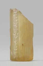 | Keywords: Mesopotamian - Cylinder Seal with Human Headed Winged Bull and Inscription - Walters 42808 - Side A.jpg This scene on this seal depicts a human headed winged lion wearing a horned crown with an inverted crescent in the field above him The scene also incorporates a cuneiform inscription in three registers late 2nd millenium BC Neo-Babylonain ; Assyrian yellow transparent stone cm 2 4 0 9 accession number 42 808 4549 Sadie Jones Mrs Henry Walters New York date and mode of acquisition unknown Sale Joseph Brummer New York 1941 Walters Art Museum 1941 by purchase Museum purchase 1941 Inscription place of origin Mesopotamia Walters Art Museum license Cylinder seals in the Walters Art Museum Art of Mesopotamia in the Walters Art Museum Lions in art of the ancient Near East Cuneiform on cylinder seals Cuneiform on media Griffin cylinder seal Walters 42808 Walters Art Museum cylinder seals with cuneiform Animals in art of the ancient Near East An cuneiform Media contributed by the Walters Art Museum needs category review |