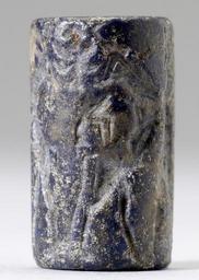 | Keywords: Mesopotamian - Cylinder Seal with Figures in Combat with Horned Animals - Walters 42628 - Side F.jpg Combat scenes between humans and other creatures became very popular in the later Early Dynastic period The intricate pairing of interlocking figures creates an elaborate decorative pattern The star between the heads of the bull and goat may represent the sign for deity between 2600 2350 BC Early Dynastic II-Early Dynastic III lapis lazuli cm 2 1 1 accession number 42 628 7665 Mrs Henry Walters New York Sale Joseph Brummer New York 1941 Walters Art Museum 1941 by purchase Museum purchase 1941 place of origin Mesopotamia Walters Art Museum license Cylinder seals in the Walters Art Museum Art of Mesopotamia in the Walters Art Museum Media contributed by the Walters Art Museum needs category review |