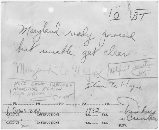 Keywords: Message pertaining to the attack on Pearl Harbor. - NARA - 296802.jpg Scope and content This is a message from the USS MARYLAND BB46 in the inboard berth position of the USS OKLAHOMA BB37 which had capsized within minutes of the attack General notes 296802 Local identifier Department of the Navy Fourteenth Naval District 1916 - 09/18/1947 NARA's Pacific Region San Bruno NRHAS 1000 Commodore Drive San Bruno CA 94066-2350 date 1941 12 07 - 1941 12 07 Record group Record Group 181 Records of Naval Districts and Shore Establishments 1784 - 2000 Record group ARC 510 Pearl Harbor Attack Dispatches compiled 12/07/1941 - 12/11/1941 Series ARC 296793 File unit Copies of Dispat6ches Sent Out and Recieved December 7 1941 Dec 7 1941 Traffic Covering Local Times 0745 Dec 7 1941 to 0220 8 Dec 1941 Signal Tower Navy Yard 1 of 2 12/07/1941 - 12/07/1941 File unit ARC 296794 Variant control numbers NAIL Control Number NRHS-181-14NDH-DISPATCHSENT 2 -8<br /> Other Identifier GCT 1932 TOD Other versions <gallery> File Message_pertaining_to_the_attack_on_Pearl_Harbor _-_NARA_-_296802 tif tif File Message_pertaining_to_the_attack_on_Pearl_Harbor _-_NARA_-_296802 jpg jpg </gallery> NARA-cooperation PD-USGov USS Maryland BB-46 |
