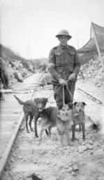 | Keywords: australian war memorial australianwarmemorial railway railway tracks railwaytracks dog helmet uniform messages communications ww1 first world war firstworldwar soldiers mutt mix-breed mixbreed dogs animal animals canis mammal mammals handler messenger dog messengerdog messenger dogs messengerdogs france villers-bretonneux villersbretonneux picardie 1918 corporal james coull jamescoull james coull 4th division signal company 4thdivisionsignalcompany 101 102 103 war dog wardog war dogs wardogs nell trick buller bullet cross setter crosssetter setter collie airedale 12th brigade 12thbrigade man soldier leash leashes chain chains person blackandwhite monochrome outdoor black and white ID Number: E02318 Place made: France: Picardie, Somme, Villers-Bretonneux Informal portrait of 3133 Corporal James Coull, in charge, with dogs of No. 3 Messenger Dog Section, attached to the 4th Divisional Signal Company, in a railway cutting near Villers-Bretonneux while operating with 12th Brigade. Section comprised sixteen men and fifty messenger dogs. These dogs worked with fairly successful results, but were never solely relied on in sending messages. Left to right: War Dog 103 Nell, a Cross Setter; 102 Trick, a Collie; 101 Buller (sometimes referred to as Bullet), an Airedale. All three dogs were very efficient in message carrying and saw service with the 2nd, 4th and 5th Australian Divisions, also with Divisions of the British 8th Corps (Imperial). 102 Trick was particularly efficient and was well known by all Brigades of abovenamed Divisions. He was specially mentioned by Signal Officer of 2nd Division for good work at Rubimont, near Heilly. Rights Info: No known copyright restrictions. This photograph is from the Australian War Memorial's collection www.awm.gov.au Persistent URL:http://cas.awm.gov.au/item/E02318 ID Number: E02318 Place made: France: Picardie, Somme, Villers-Bretonneux Informal portrait of 3133 Corporal James Coull, in charge, with dogs of No. 3 Messenger Dog Section, attached to the 4th Divisional Signal Company, in a railway cutting near Villers-Bretonneux while operating with 12th Brigade. Section comprised sixteen men and fifty messenger dogs. These dogs worked with fairly successful results, but were never solely relied on in sending messages. Left to right: War Dog 103 Nell, a Cross Setter; 102 Trick, a Collie; 101 Buller (sometimes referred to as Bullet), an Airedale. All three dogs were very efficient in message carrying and saw service with the 2nd, 4th and 5th Australian Divisions, also with Divisions of the British 8th Corps (Imperial). 102 Trick was particularly efficient and was well known by all Brigades of abovenamed Divisions. He was specially mentioned by Signal Officer of 2nd Division for good work at Rubimont, near Heilly. Rights Info: No known copyright restrictions. This photograph is from the Australian War Memorial's collection www.awm.gov.au Persistent URL:http://cas.awm.gov.au/item/E02318 |