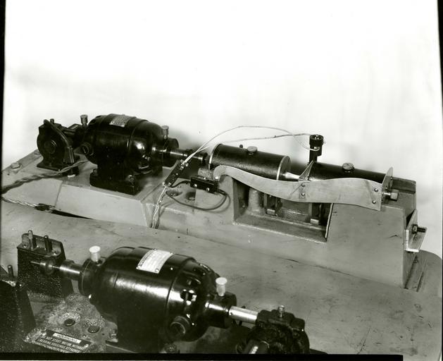 Keywords: MetalFatigue 001.jpg The two newly-developed automatic stopping devices installed on a fatigue-testing machine at the National Bureau of Standards Note the motor in the foreground is not part of the set-up The metal specimen under test is held in place between the two bearing boxes right The bearing boxes are supported at the ends away from the specimen and weighted at the ends near the specimen so that the weighted ends tend to sag more when a crack begins to form in the specimen If the crack is on only one side of the specimen vibration as well as sagging will result The deflection-responsive stopping device consists of the microswitch center actuated by the lever rigidly fastened to the right-hand bearing box The vibration-responsive device just behind and to the right of the specimen consists of a steel ball poised on a pedestal; when vibration shakes the ball from the pedestal it closes a circuit Both devices are used simultaneously at NBS with their circuits in parallel; either may be actuated first depending on the nature of the incipient crack National Institute of Standards and Technology National Institute of Standards and Technology PD-USGov-NIST PD-USGov National Bureau of Standards National Institute of Standards and Technology |