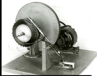 | Keywords: MetalFatigue 004.jpg Apparatus used at the National Bureau of Standards for polishing smooth fatigue test specimens Motor driven the equipment produces a highly uniform finish from specimen to specimen The polishing wheel consisting of a large number of metal spring leaves presses an abrasive belt against the specimen with uniform pressure The specimen itself is rotated at a constant rate and advances slowly over the abrasive surface during the polishing operation National Institute of Standards and Technology National Institute of Standards and Technology PD-USGov-NIST PD-USGov National Bureau of Standards National Institute of Standards and Technology |