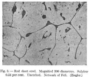 | Keywords: Metallography of iron FeS inclusions.PNG en Inclusions of Iron sulphide FeS at the grain boundary on a red short steel fr Inclusions de sulfure de fer FeS au joint de grain sur un acier cassant à chaud http //www archive org/details/metallographyofi00sauvrich The metallography of iron and steel by Albert Sauveur Lesson VI page 5 Albert Sauveur 1912 PD-old PD-US Metallography of iron-based alloys | ||||