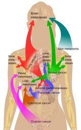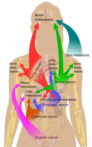 | Keywords: Metastasis sites for common cancers.svg metastases for common cancer types Primary cancers are denoted by cancer except for skin melanoma and their main metastasis sites are denoted by metastases List of included information The included cancer types are the ones causing most death as per data from the US in 2008 <ref name Jemal> cite journal Jemal A Siegel R Ward E et al Cancer statistics 2008 CA Cancer J Clin 2008 71 “96 58 2 http //caonline amcancersoc org/cgi/content/full/58/2/71 18287387 10 3322/CA 2007 0010 </ref> Lung cancer mainly to adrenal glands brain and bone<ref>http //www atcs jp/pdf/2005_11_6/401 pdf http //www ncbi nlm nih gov/pubmed/16401990 PMID 16401990 Long-term survival cases of lung cancer presented as solitary bone metastasis </ref> Breast cancer mainly to bone liver lung and brain <ref name pmid17158753 > Cite journal Lacroix M Significance detection and markers of disseminated breast cancer cells Endocrine-related Cancer 13 4 1033 “67 2006 December 17158753 10 1677/ERC-06-0001 </ref> Colon cancer mainly to liver <ref>http //www cancer gov/cancertopics/factsheet/Sites-Types/metastatic Metastatic Cancer Questions and Answers fact sheet from the National Cancer Institute Reviewed 09/01/2004</ref> Pancreatic cancer mainly to liver and lungs <ref> http //emedicine medscape com/article/280605 Medscape > Pancreatic Cancer Author Tomislav Dragovich Chief Editor Jules E Harris Updated May 5 2011</ref> Melanoma mainly to brain<ref>http //www moffitt org/CCJRoot/v2n5/article3 html Melanoma Metastasis By Isaiah J Fidler Cancer Control Journal Vol 2 No 5 September/October 1995</ref> Ovarian cancer mainly to pleural cavity and liver<ref>http //jco ascopubs org/content/20/4/982 full pdf http //www ncbi nlm nih gov/pubmed/11844820 PMID 11844820 Epithelial Ovarian Cancer Metastasizing to the Brain A Late Manifestation of the Disease With an Increasing Incidence</ref> Not included information of major importance Prostate cancer in males usually metastasizes to the bones <ref name 'metastasis-route'> cite web http //www med-ed virginia edu/courses/path/gu/prostate3 cfm Male Genitals - Prostate Neoplasms 2011-04-28 Pathology study images University of Virginia School of Medicine http //www webcitation org/5yHQ19Rrp 2011-04-28 </ref> References reflist All imaged used are in the Public Domain Mikael Häggström 2011-05-22 Metastasis sites for common cancers-IT png Metastasis sites for common cancers-IT svg Cc-zero Human body diagrams Metastasis SVG female shadow diagrams |
