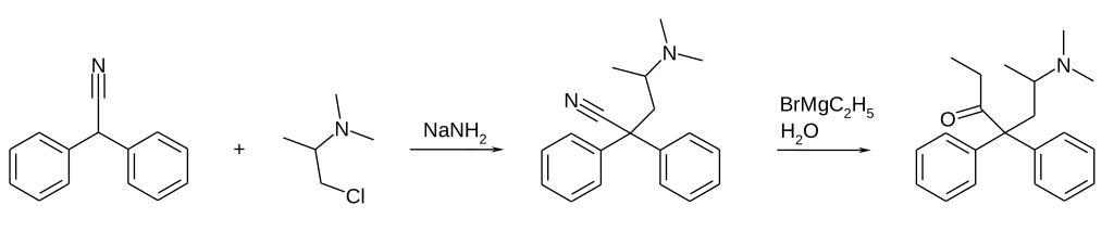 Keywords: Methadone synthesis 01.svg en Synthesis of methadone de Synthese von Methadon own Steffen 962 2011-08-17 PD-chem Cc-zero Methadone