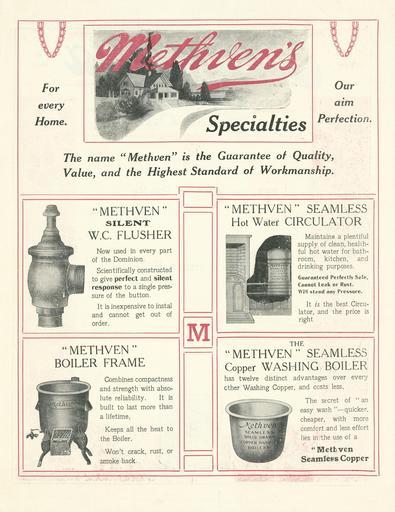 Keywords: text Methven products shown include the Methven silent W.C. flusher, seamless hot water circulator, boiler frame and seamless copper washing boiler. Quantity: 1 colour photo-mechanical print(s) on pamphlet. Physical Description: Offset print on folded pamphlet, 297 x 230 mm. Provenance: Purchased from Barney Brewster, Nelson, in 2004. Methven Ltd :Methven's specialties for every home. [ca 1910]. [Pamphlet advertising Methven boilers and pipes, Creamoata, Thomson's Purity Raspberry Vinegar, and Thomson's Purity Lime Juice. ca 1910].. Ref: Eph-B-RETAIL-1910-01-01. Alexander Turnbull Library, Wellington, New Zealand. natlib.govt.nz/records/22765351 Methven products shown include the Methven silent W.C. flusher, seamless hot water circulator, boiler frame and seamless copper washing boiler. Quantity: 1 colour photo-mechanical print(s) on pamphlet. Physical Description: Offset print on folded pamphlet, 297 x 230 mm. Provenance: Purchased from Barney Brewster, Nelson, in 2004. Methven Ltd :Methven's specialties for every home. [ca 1910]. [Pamphlet advertising Methven boilers and pipes, Creamoata, Thomson's Purity Raspberry Vinegar, and Thomson's Purity Lime Juice. ca 1910].. Ref: Eph-B-RETAIL-1910-01-01. Alexander Turnbull Library, Wellington, New Zealand. natlib.govt.nz/records/22765351 |