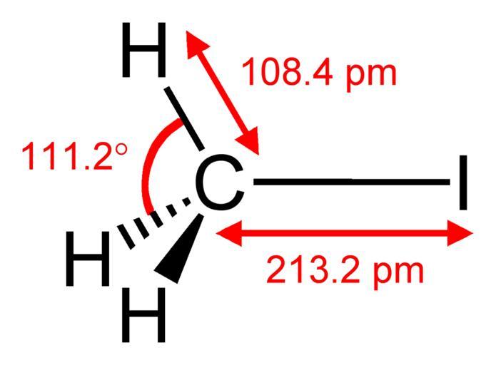 Keywords: Methyl-iodide-CRC-MW-IR-dimensions-2D.png Structural formula of the methyl iodide iodomethane molecule MeI CH<sub>3</sub>I Structural information determined by microwave and infrared spectroscopy from http //www hbcpnetbase com/ CRC Handbook 88<sup>th</sup> edition Own 2009-03-15 Ben Mills Benjah-bmm27 Images by Ben Mills Iodomethane |