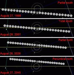 | Keywords: Metonic lunar eclipses 1988-2045.png en wikipedia 2011 October 26 August 2007 lunar eclipse chart 2008-4-1 self-made<br />Transferred from http //en wikipedia org en wikipedia SockPuppetForTomruen talk Image Lunar eclipse chart-07aug28 gif en wikipedia SockPuppetForTomruen Original upload log page en wikipedia Metonic_lunar_eclipses_1988-2045 png 2008-04-01 01 22 SockPuppetForTomruen 506×519 38160 bytes <nowiki> Summary August 2007 lunar eclipse chart self-made SockPuppetForTomruen talk SockPuppetForTomruen 515×650 44126 bytes <nowiki> February 2008 lunar eclipse chart self-made SockPuppetForTomruen talk SockPuppetForTomruen 506×519 38160 bytes <nowiki>Reverted to version as of 01 22 1 April 2008</nowiki> 1988 Lunar eclipse of 2007 August 28 2026 2045 |