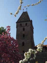 Keywords: metzgerturm ulm tower city wall old town cherry blossom white cherry spring blossom bloom white blossom bloom tree blossom branches herrlich overflowing lush blütenmeer flower tree summer day sunny day