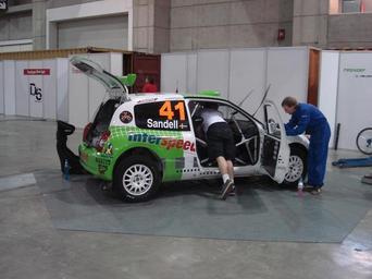 Keywords: MEX 2008 RB 41 service.jpg Patrick Sandell's Renault Clio S1600 parked prior to the 2008 Rally Mexico at rally base in the Poliforum in Leon Mexico Own 2008-02-27 Joshbaumgartner 2008 Rally Mexico Patrik Sandell Renault Clio Super 1600