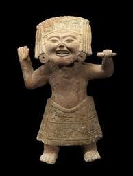 | Keywords: Mexican - Female Ritual Performer - Walters 20092047.jpg South-central Veracruz was home to a number of vibrant sculptural traditions Among them is the so-called Nopiloa style named for the archaeological site of Nopiloa located in the Mixtequilla area of southern Veracruz Hundreds if not thousands of these striking figures were produced during the Late Classic Period ranging from small figures to large-scale sculptures most of which were made in press molds with some hand-modeling for adding accouterments of dress The figures may depict ritual performers or intended sacrificial victims in the midst of a trance induced by the ingestion of mind-altering substances such as hallucinogenic plants animal poisons or alcohol It has been suggested that these figures represent the Classic Period antecedents of the ritual practices of induced joviality and ecstatic dance in honor of the Postclassic deity Xochipilli-Macuilzochitl These Nopiloa figures typically are portrayed with upraised head and arms held at the side of the head Usually the right hand clutches an object that eludes identification although it has been variously suggested to be a rattle a potent native tobacco cigar or a hallucinogenic plant material AD 600-900 Late Classic earthenware cm 40 32 24 13 10 16 accession number 2009 20 47 80202 Economos Works of Art date and mode of acquisition unknown John G Bourne 1990s by purchase Walters Art Museum Gift of John Bourne 2009 place of origin southern Veracruz Mexico Walters Art Museum license Mexican Pre-Columbian art in the Walters Art Museum Media contributed by the Walters Art Museum needs category review Mexican - Ritual Performer - Walters Art Museum |